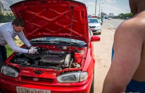Опять остановка. Красный Hyundai Lantra, видно, недавно покрасили, на стекле объявление о продаже. Водитель спортивного телосложения, играя мускулатурой, охотно открывает капот.