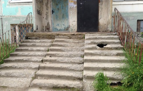 Подъезд дома № 12 просто шокирует: разваленные и расколотые ступени могут легко стать причиной переломов и несчастных случаев, но неровностями все не ограничивается: прямо в центре лестницы огромная дырка, в которую с легкостью можно угодить в сумерках.