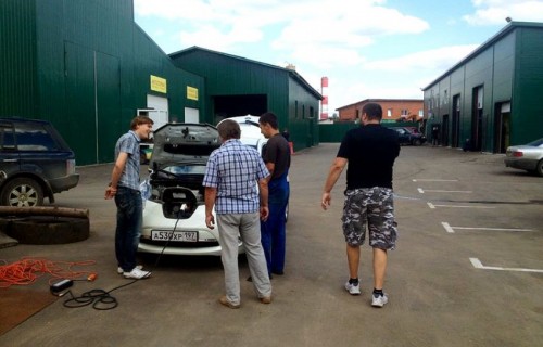 Несолоно хлебавши, мы отправились домой, собирая остатки вечерних пробок. Тут стоит отметить, что по густым пробкам понедельника с 17,30 до 20.00 мы проехали чуть более 45км по навигатору, а запас хода сократился на 50км. С учетом погрешности одометра, точность показаний на удивление высокая и ей смело можно доверять, с одной оговоркой — ехали мы без музыки, климата, света (ну кроме ДХО разумеется), в достаточно плотном трафике и аккуратно, не пытаясь выиграть пару корпусов у потока. На следующий день решено было испытать работоспособность ближайшей станции, оставшейся в ведении Револьты, в Мневниках. Находится она на территории достаточно крутого тюнинг-центра и пробираться к розетке пришлось по тесной парковке между бентлями и прочими амг, стоимостью раз в 10 больше нашего Лифа. :))