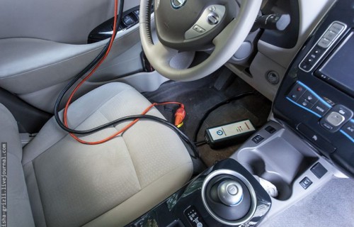 Автомобиль массой около 1500кг приводится в движение электродвигателем мощностью 80 кВт(?110лс) и моментом 280Нм, который доступен со старта. Трансмиссия ограничивается из одноступенчатым редуктором с передаточным отношением 1:7.94, передающим момент на переднюю ось. Поэтому — потерь никаких и резкозти Leaf в городской толчее позавидует иной спорткар. Но, за каждый форсаж приходится не пропорционально расплачиваться запасом энергии 24 киловатной батареи. И если пытаться дерзить потоку, запас хода начинает таять на глазах. Такая же картина наблюдается на скоростях за 100.. Так что всегда стоит выбор — ехать побыстрее или подальше 🙂 Чтобы зарядиться полностью от обычной розетки нам надо часов 7, а сидеть до ночи никому не охота 🙂 Поэтому одалживаем у Леши удлинитель и едем домой.