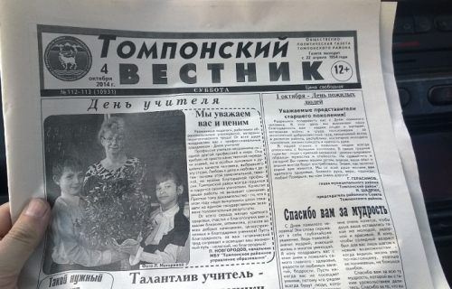 Дальше по трассе – Хандыга (411 км). Здесь и заправки, и кафе, и ночлег, и шиномонтаж, и автосервис. Мы рекомендуем кафе-ресторан «Сайдыы». Очень вкусно, быстро и недорого. Также в Хандыге имеются супермаркеты, торговые центры, работает такси – поездка от 90 рублей. Здесь ходят микроавтобусы до Усть-Неры и Якутска. Поездка в столицу республики Саха стоит от 2 тысяч рублей. Пресса здесь выходит на двух языках: якутском и русском.