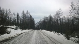 Где-то на 600 км на склонах вдоль дороги появляется редкий стланик, лиственница и березы становятся тоньше и ниже.