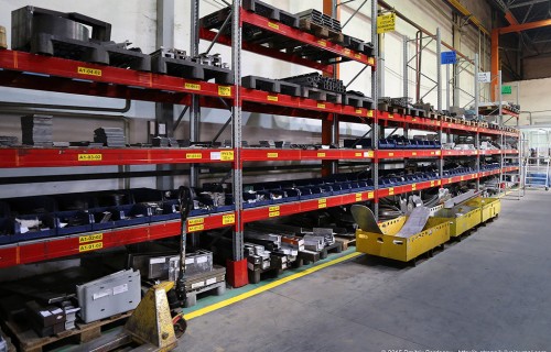 Все необходимые детали размещаются на стелажах, что экономит пространство в цехе. На желтых тележках детали развозятся по рабочим местам.