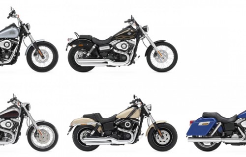 Всего в этой группе сегодня пять моделей, тоже, как и в случае со Спортстером, различающихся лишь деталями. Назову их по-порядку, как они приведены на картинке: Street Bob, Wide Glide, Low Rider, Fat Bob и приспособленная для дальних поездок Dyna Switchback. Последнюю можно узнать по съемному ветровому стеклу и жестким кофрам. Тоже, естественно, съемным.