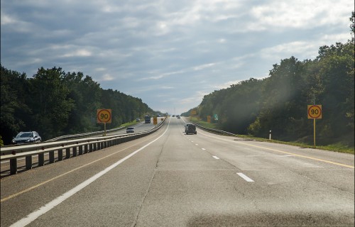 А вот теперь представьте, что вы движетесь вот по этой широкой четырехполосной магистрали, на которой до того зеленого знака вообще разрешенная скорость составляет 130 километров в час. И вдруг видите идущие один за другие ограничения 90, 70 и 50, знак ремонта дороги и запрещения обгона.