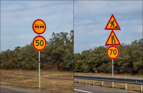 А вот теперь представьте, что вы движетесь вот по этой широкой четырехполосной магистрали, на которой до того зеленого знака вообще разрешенная скорость составляет 130 километров в час. И вдруг видите идущие один за другие ограничения 90, 70 и 50, знак ремонта дороги и запрещения обгона.