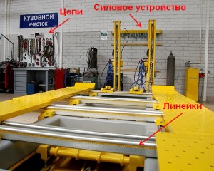 Тянут на специальном стапеле: автомобиль крепится к его основанию за пороги с помощью зажимов, а усилие передается от силового устройства (например, рычажно-гидравлического типа) через специальные цепи с крюками. На стапеле предусмотрена система линеек и шаблонов, с помощью которых мастер определяет, насколько именно вытягивать элемент.