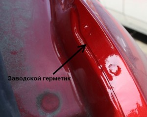 Заводской герметик выглядит аккуратно, хорошо прокрашен и часто почти незаметен. При кузовном ремонте его наносят более узловато, часто размазывают, а консистенция порой похожа на высохшую краску.