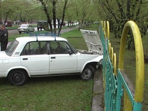 Но все-таки есть бог на свете — за 2 метра до забора машина глохнет, и, торкнувшись пару раз для приличия, замирает сантиметрах в 30 от забора. Мужик садится на землю и истерически ржет (пробрало, видать). Видимо, поняв, что не его сегодня день, мужик закатывает машу обратно на парковочное место, от души пинает ее минуты 2, матерясь так, что голуби срываются с мест, потом запирает ее и удаляется по своим делам. Как только он скрывается за домом, машина трогается с места, и набрав не очень большую, в принципе, скорость, умудряется своротить себе об забор бампер, свернуть решетку и раздолбать фары… Недаром говорят — есть жена, и есть любимая…
