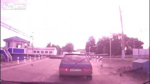 Видимо мотоциклист слишком рано тронулся на железнодорожном переезде.