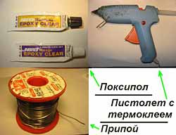 После пайки и установки конструкций на основе СИД, необходимо их зафиксировать и защитить от влаги (если требуется). При отсутствии фиксации, если проводники оставлены длинными, то от сильной вибрации они могут переломиться. Влага губительно действует на ножки элементов и места паек. Я использую два типа материалов. Поксипол (эпоксидная смола) стоит примерно 200р и всегда пригодится в домашнем хозяйстве. Продается в виде двух маленьких тюбиков, удобен в применении. Смешиваю пару капелек и наношу на нужные места с помощью зубочистки. Термоклей - это полимер, который принимает жидкое состояние при нагревании. Продается в виде цилиндрических палочек, которые заправляются в специальный электрический термопистолет. На рисунке изображены используемые мною расходные материалы.