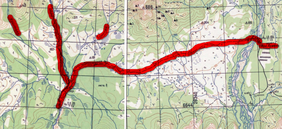 Вот кусок карты где видна тракторная дорога, которая ведет от Новой Армани к Ойре, дорога выходит ниже места слияния Озерного и Кристалла. Ну а так то она уже заросла наверное.