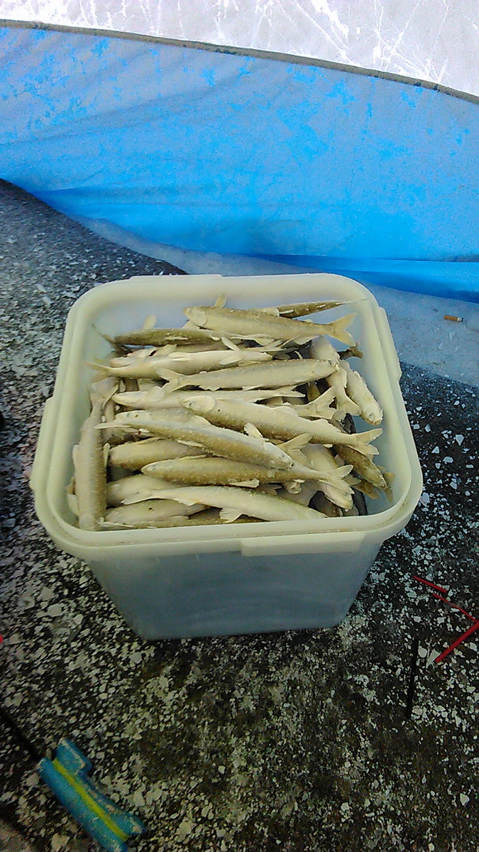 Лёд стоит как и стоял. Сегодня ловил на тех же лунках что и позавчера, там же на глубине, недалеко от елки. Сегодня 61 корюшка , 4,8кг, позавчера было 108 кор-6,8кг. Рыбы столько же, но крупнее, поймал меньше потому как уезжал с лунок, искал что-то ещё и ничего не нашёл, вернулся, а рыба там же.