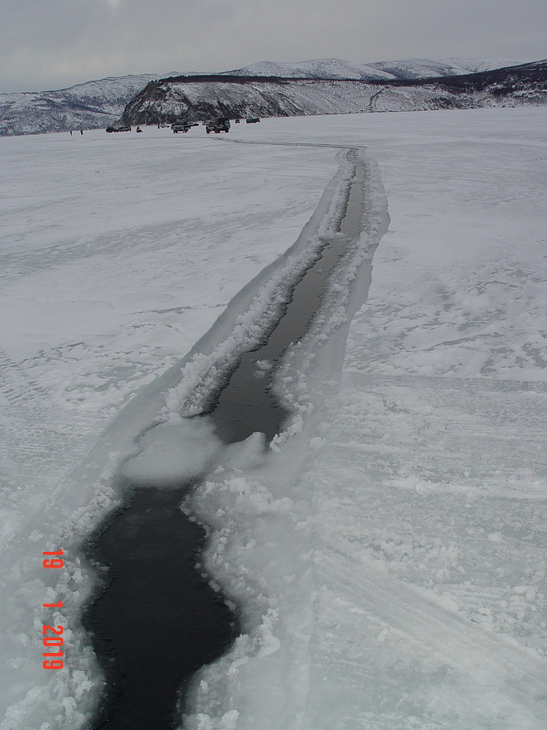 Вчера в 16-00 подъехал на "Марчеканский" пирс, дорога уже накатана. На льду было 2 снегохода ( красный и жёлтый ) ставили сети и стояло 2 рыбака, за 10 минут что за ними наблюдал не ловили. Съезд на лёд для джипов в этом году будет, но пока видел следы пневматика, хотел съехать на лёд, но первому как-то страшно, хотя внешне обстановка стабильная.