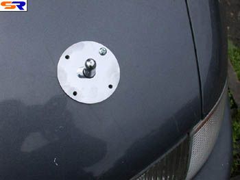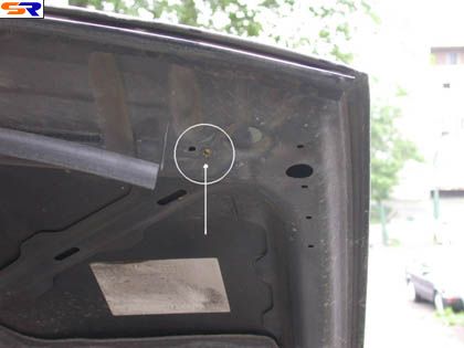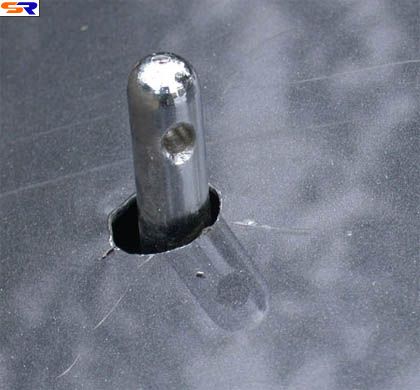 5) Самая ответственная часть процедуры - сверление капота. Берем тонкое сверло и сверлим капот насквозь изнутри. Центр отверстия - в солидольной метке. Меняем сверло на большое и увеличиваем отверстие. После этого аккуратно опускаем капот и видим, в какую сторону нужно увеличивать отверстие. Берем круглый напильник и не торопясь убираем лишний металл - он очень легко поддается такой обработке. Не забываем постоянно контролировать положение штока в получившемся отверстии. В конечном итоге капот должен легко закрываться, не касаясь штоков. Зазор между штоком и капотом должен быть 1-2 мм.