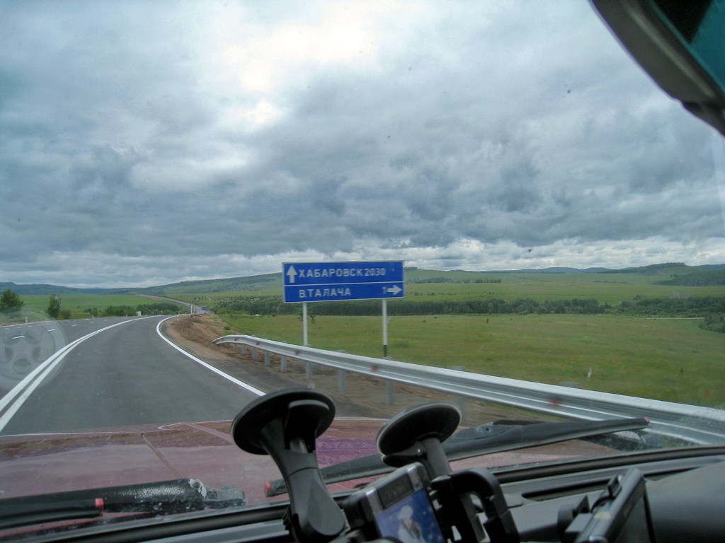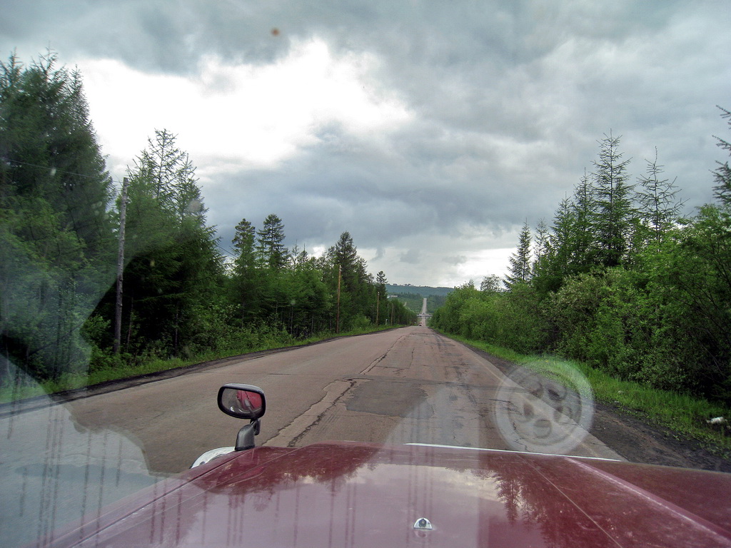 Фото дороги практически нет, потому как штурман опять нагло начал дрыхнуть. Сама трасса начала поднимтаься в горы, вокруг кедровый лес, по обочиная таблички – «Осторожно! В лесу – клещ! Убьет». Решили, что имеет смысл – не останавливаться, и тем более в лес не ходить.