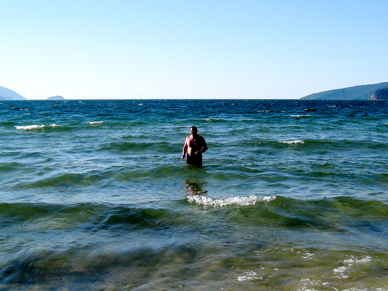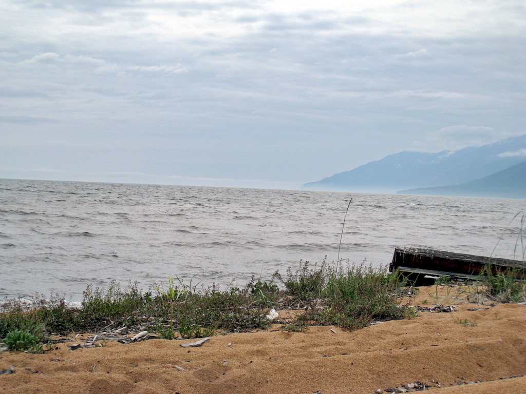 Баргузинский залив – пасмурно –и было не очень красиво..Кстати, ощутили, что возле воды довольно прохладно.