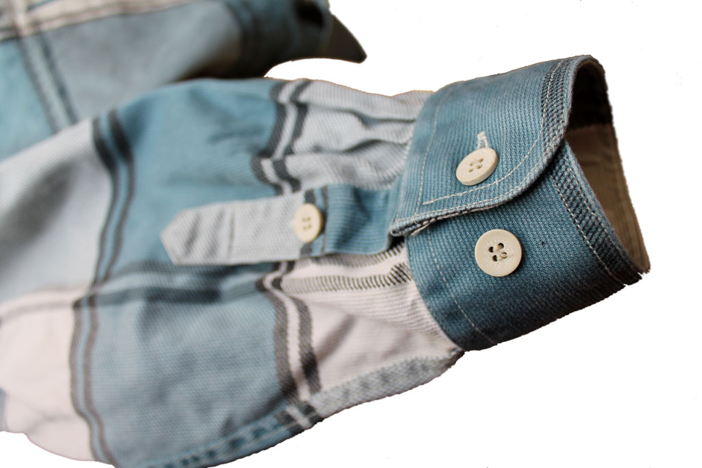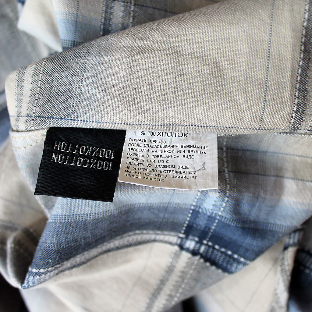 Плотная, 100% хлопок, металлические заклёпки, на груди два кармана на обычных пуговицах, дополнительная заклёпка на рукаве.