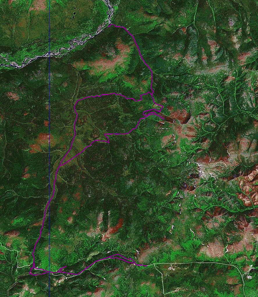 Прошли втроем по кругу вокруг массива г. Англия от ГАИ, по верхам вышли между Лесной Школой и Орбитой, по полям на Ланкучане в сторону озер на тундре, потом за р. Сердях, клепкинская трасса и по "новой" ЛЭП выскочили через Ольский перевал на дачи.