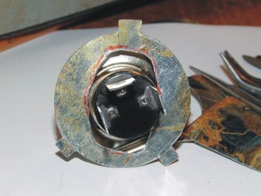 Нажмите для просмотра прикрепленного файлаНажмите для просмотра прикрепленного файла Обрезаем жесть по получившемуся контуру. Затем делаем разрез между примыкающими друг к другу усиками. Надеваем накладку на заднюю часть цоколя лампочки и подгоняем внешнюю форму кольца и усиков. Далее, расширяем центральное отверстие в кольце, примерно так, как показано на фото, чтобы фиксирующая пружина проходила в это отверстие и фиксировала лампочку за цоколь, а не за накладку.