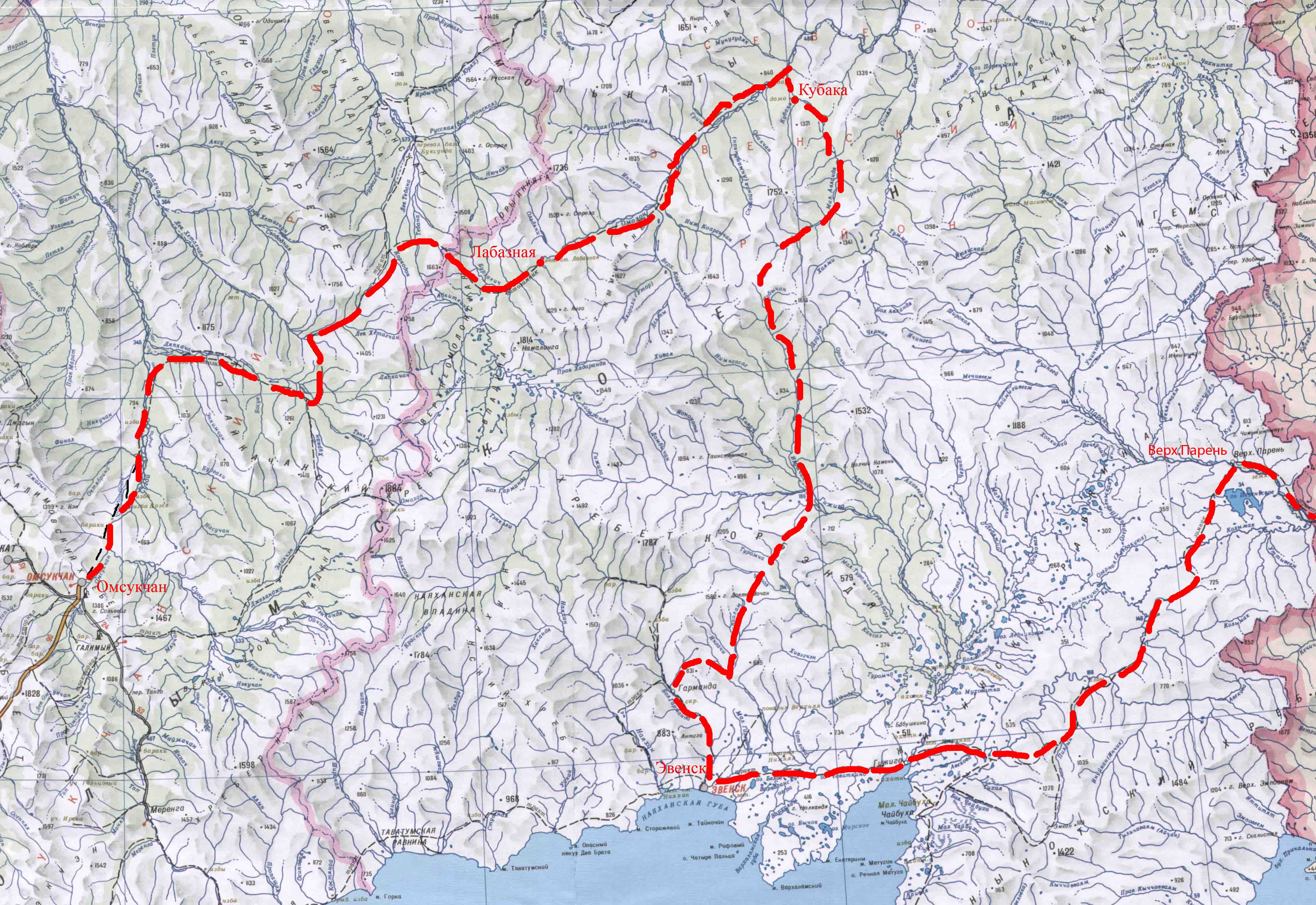 Карта красивая, но времен давнишних. С тех пор, как между СК и Эвенском проложена круглогодичная дорога, то конечно, для "чистоты эксперимента" можно ехать и минуя Гарманду, но ни к чему