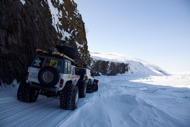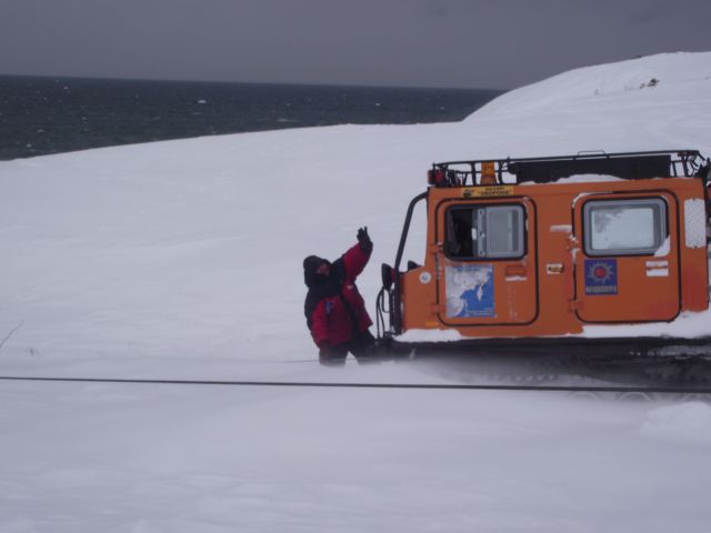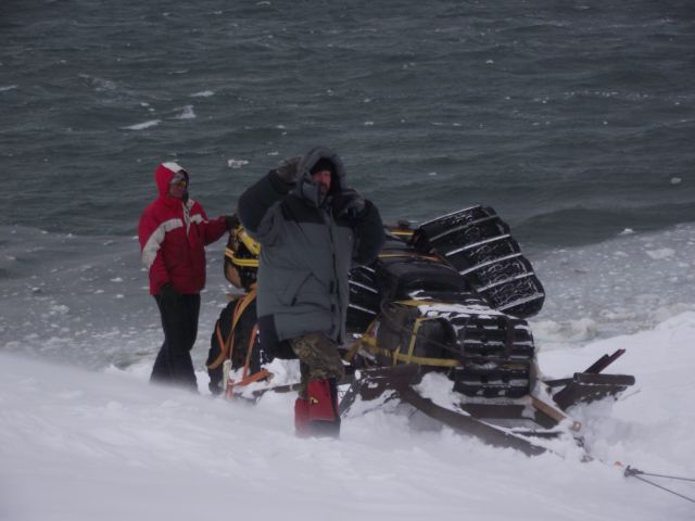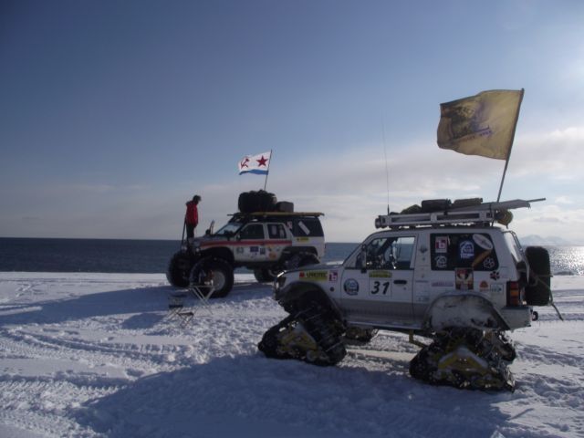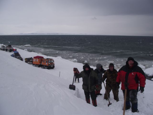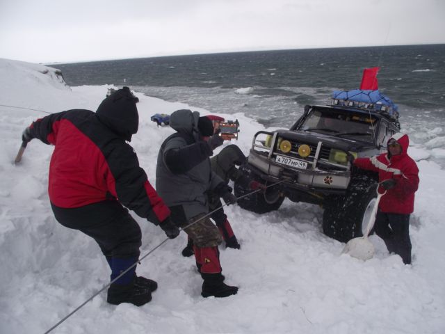 Вместо гусянок назад установили на задний мост Паджеро "масенькие" 35-ые колёсики и полезли в о.!.!.у До подъёма выдохнули. А вот тут-то и потратили пельменные калории на лопаты часика за 3. Однако Сохатый даже без прицепа не взял высотку. Вот он звёздный час АнатлеНиколаемобиля. Они слегка подровняли лопатами тычок слева и поползли вверх. Но и тут без лебёдки не обошлось. Закопали в сугроб "Шнягу" и, заякорившись, вылезли. У Лося уже образовались два якоря. Они нас и извлекли. Затем дВова с Олегом подползли, их расцепили поочереди выволокли. Продос рванул вниз за своим прицепом. Пока поднимали в две лебёдки нашу арбу, Океан пару раз окатил Толемобиль потной смесью шуги, солёнки и близкой пресной ручейковой воды. Тросолебёдные дела отняли ещё тройку часиков. Остаточные запасы пива закончились именно на этой вертикали.