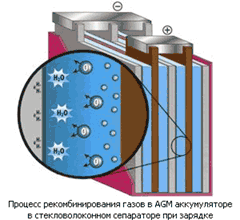 Нажмите для просмотра прикрепленного файлаНа химическом же уровне уникальность автомобильных аккумуляторов AGM заключается в рекомбинирующих свойствах аккумуляторов AGM. При протекании химических реакций внутри любого аккумулятора образуются газы, состоящие в основном из водорода и кислорода, из молекул которых состоит вода. Образовавшиеся газы заполняют микропоры и участвуют в химических процессах, которые протекают во время зарядки аккумулятора и в виде воды смешиваются с электролитом. Этот химический процесс разделения и смешивания и называется рекомбинацией. В современных автомобильных аккумуляторах процесс практически полной рекомбинации доведен до 96-98%. Это говорит о практически ничтожном изменении химических свойств электролита на протяжении длительного времени и незначительных количествах свободного газа, давление которого внутри аккумуляторной батареи регулируется специальным клапаном. Этот клапан также является гарантом безопасности аккумуляторной батареи срабатывая при возникновении нештатной ситуации.