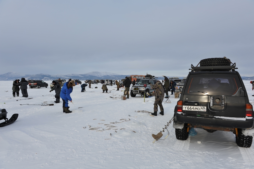 Сегодня в 13.30 вышли с МЛКВД,на ольский лиман 17.45. На 23км.и 61км.от МЛКВД наледи лучше проходить с подстраховкой(всего 70км. по навигатору от...и до...)заносики по чистому и кочке. В 14.00 встретили rav-4,сузуки 5дверку. Рыба есть.По дороге ветерок.