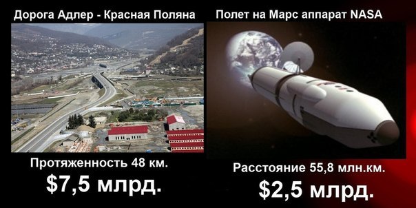 Что представляет мегаэксперт, прочитав словосочетание «олимпийская дорога Адлер — Красная Поляна»? Пред внутренним взором мегаэксперта предстает... ну конечно же дорога! Шириной 20 метров. Красная цена — 3 лимона рублей за км. Мегаэксперт делит 227 млрд на 48 км и — внимание! — полученное число значительно превышает 3 млн. Вывод мегаэксперта однозначен — кругом наглое ворье! Воруют уже не прячась от него, мегаэксперта!