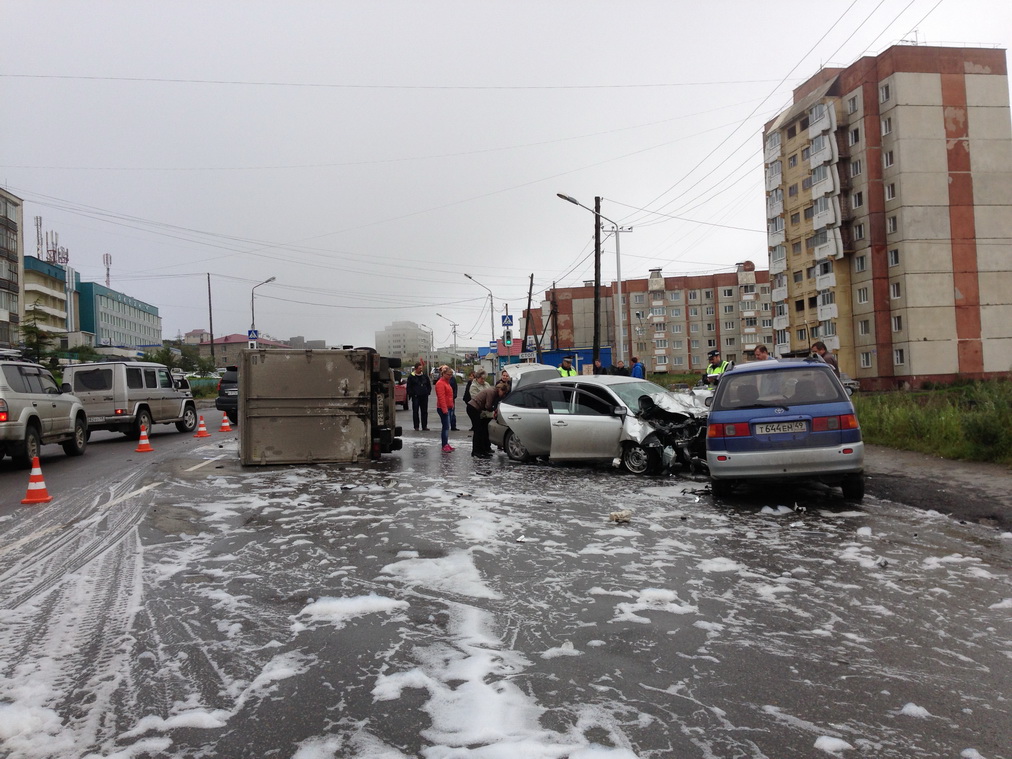 Три машинки в кучку... Грузовичек японский (с будкой) лежит на боку, его пожарные пеной заливали (скорее всего топливо с бака), Тойота Ипсум сине-голубого цвета и Тойота (по моему Аллион)... последняя очень сильно повреждена в правую переднюю часть.... да в принципе там морда вся битая... Ипсум такое ощущение вообще стоял возле обочины, а в него прилетело.... Что как было не видел, видел только последствия...