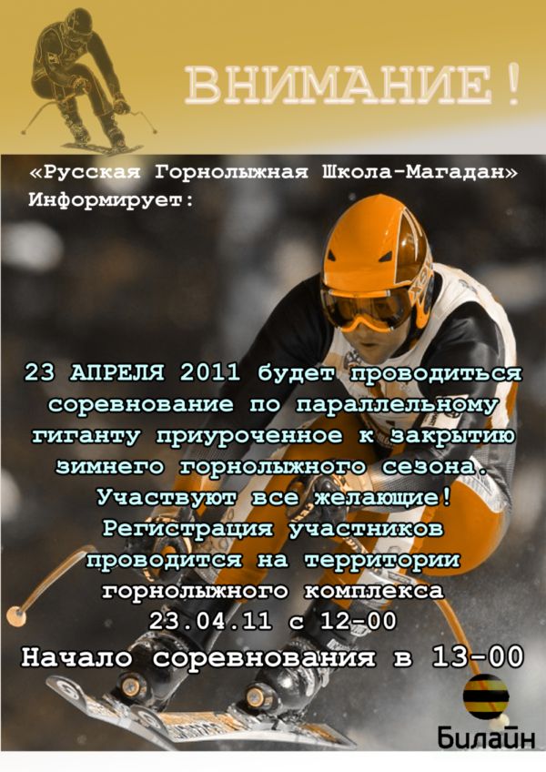 Нажмите для просмотра прикрепленного файла"Русская Горнолыжная Школа-Магадан" 23.04.2011 будет проводить соревнование по параллельному гиганту.