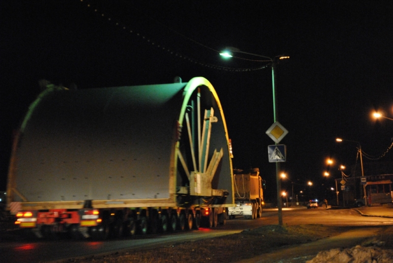 Только что провезли одну из секций. Эпическая железяка - шириной метров 7-8 ... на подъёме в помощь четырехосному седельному тягачу впереди впрягался грузовик ...