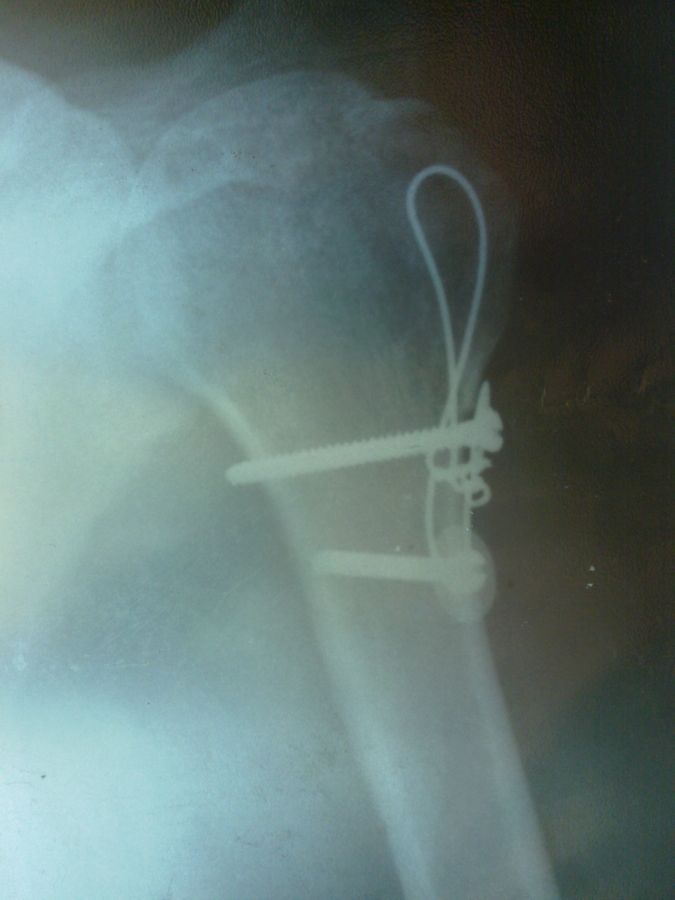 Гидр, не, не шплинт. Вот этой петлёй, которая сверху проволока давила на кусок кости который врачи отрезали от бедра и выточили из него недостающую часть для плечевой кости т.к. родная часть развалилась к чертям свинячим, а болты создавали силу давления. Там на снимке если присмотреться, то видно что кусочек большого бугра как бы не родной, типа приклееный. Короче объяснил как мог. Вот такие чудеса творят наши травматологи В.П. Лучинин и М.В. Гордин. Большое им спасибо, доктора от Бога.