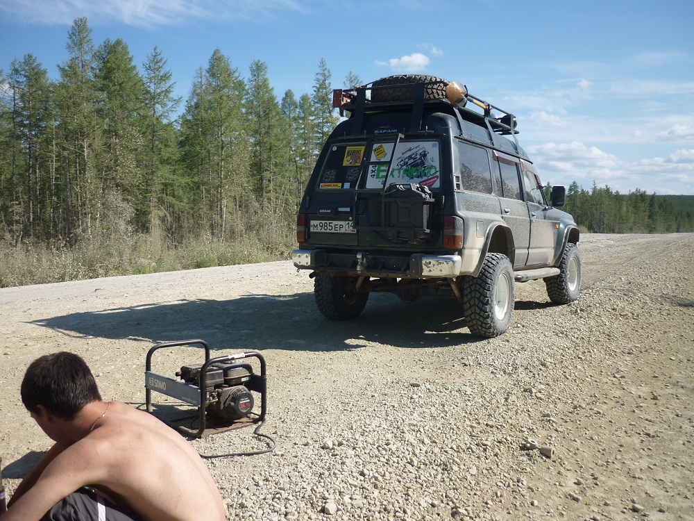 29.08.12 - выехали в 04.20. Асфальт закончился и началась грунтовка полный писец, сломались оба крепления капота, левая задняя пружина. До Качикатц дороги нет, есть только направление движения. После асфальт и грунтовка на 2+ до Чурамчи, далее до переправы опять задница. Прокололи колесо, быстро поменяли и все таки успели на переправу, в 19.50 залетели на паром последнии. На пароме уже стояли две Магаданские машины. С Кескиля до Хандыге отказали тормоза, я порывался ехать дальше без них, зачем они нам, их трусы придумали, но мой штурман (он же моя вторая половинка)