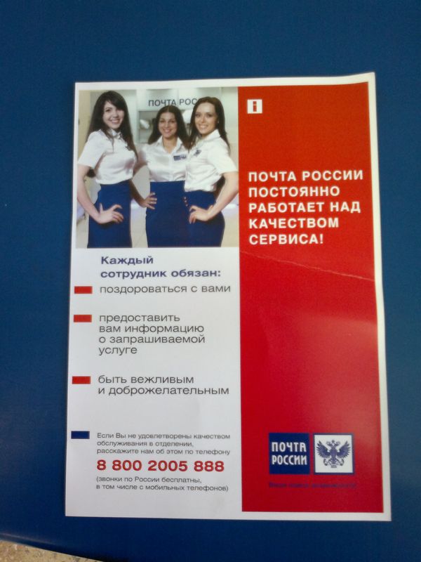 ..... я сегодня был в шоке .... забежал как всегда занять очередь за бандеролькой на Главпочтамте (так всегда раньше делал) ..... и обалдел ....... зал выдачи и отправки посылок был пуст ....два три человека в зале сидящие и зевающие три представители Почты (13:30) стойка получения и отравки пустая ..... я аж растерялся стоя в дверях ..... и упрекнул себя что не взял сразу с собой документы .... хотя до этого хожу каждый месяц и отстаиваю 3- 4 раза в очереди за посылкой по 2-3 часа чтоб её получить .... быстренько заполнил свои данные не забыв день месяц год рождения указать и код подразделения выдавшего паспорт .... сотрудницы вежливые приветливые я даже себя несколько раз поймал на мысле что это сон ..... так скажите это мне так сегодня повезло или всё таки что то произошло с нашей почтой или просто я удачно зашёл ...... да кстати не ждите прихода уведомлений - сами отслеживайте почту через интернет ...... если так будет продолжатся то ПОЧТЕ респект .....