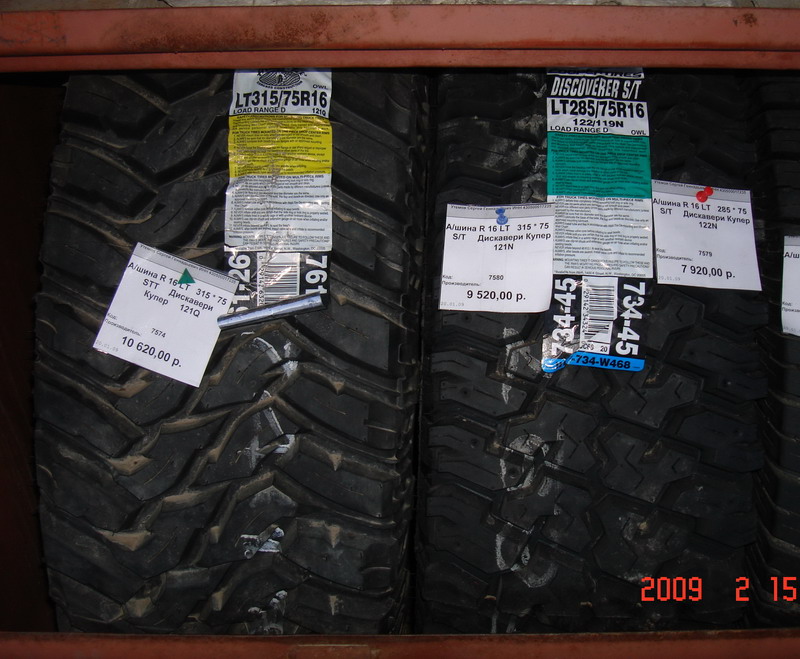 В апреле буду заказывать Бориса Федорыча, пять колес, Mud Terrain, 285/75/16 (в дюймах 33, как сейчас у тебя стоит). Присоединяйся к заказу.